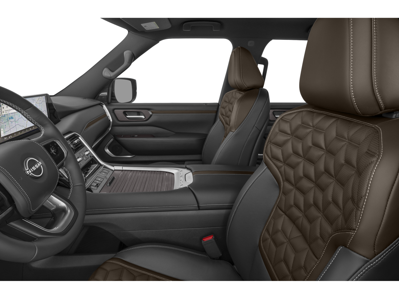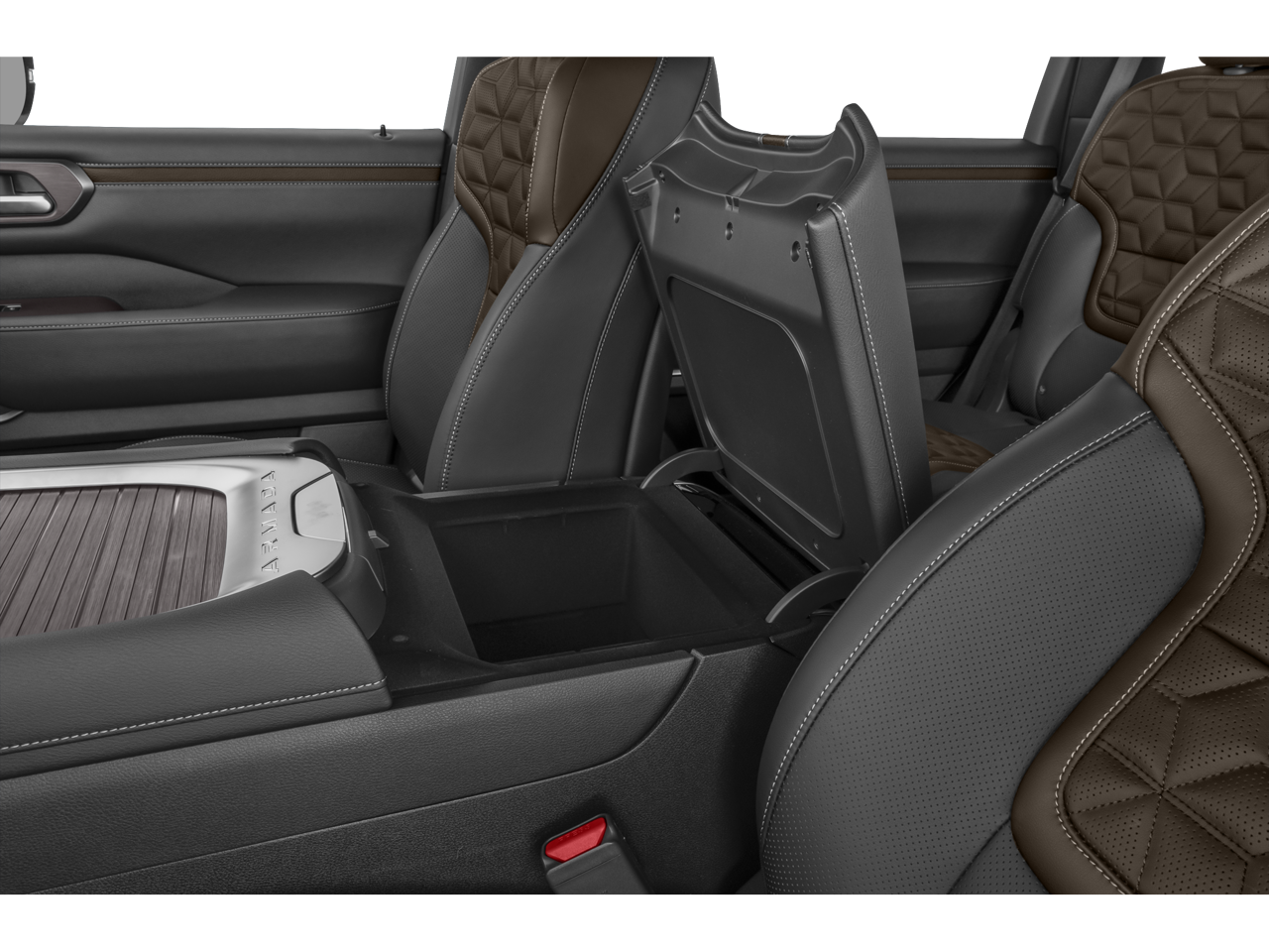 4WD, 12 Speakers, 3rd row seats: split-bench, 4-Wheel Disc Brakes, ABS brakes, Adaptive suspension, Air Conditioning, Alloy wheels, AM/FM radio: SiriusXM w/360L, Anti-whiplash front head restraints, Apple CarPlay/Android Auto, Auto High-beam Headlights, Auto tilt-away steering wheel, Auto-dimming door mirrors, Auto-dimming Rear-View mirror, Auto-leveling suspension, Automatic temperature control, Brake assist, Bumpers: body-color, Carpeted Floor Mats with Captain Chairs, Center Front Spoiler, Climate Controlled Heated and Ventilated Front Seats, Compass, Cross Bars, Delay-off headlights, Driver door bin, Driver vanity mirror, Dual front impact airbags, Dual front side impact airbags, Electronic Stability Control, Emergency communication system: NissanConnect Services, Four wheel independent suspension, Front anti-roll bar, Front Bucket Seats, Front Center Armrest, Front dual zone A/C, Front fog lights, Front reading lights, Fully automatic headlights, Garage door transmitter: HomeLink, Genuine wood dashboard insert, Heads-Up Display, Heated door mirrors, Heated front seats, Heated rear seats, Heated steering wheel, HVAC memory, Illuminated entry, Illuminated Kick Plates, Knee airbag, Leather steering wheel, Low tire pressure warning, Memory seat, Navigation system: Google Maps, Occupant sensing airbag, Outside temperature display, Overhead airbag, Overhead console, Panic alarm, Passenger door bin, Passenger vanity mirror, Power door mirrors, Power driver seat, Power Liftgate, Power moonroof, Power passenger seat, Power steering, Power windows, ProPILOT Assist 2.1, Quilted Leather Seat Trim, Radio: NissanConnect with SiriusXM 360L, Rain sensing wipers, Rear air conditioning, Rear anti-roll bar, Rear Bumper Protector, Rear reading lights, Rear window defroster, Rear window wiper, Reclining 3rd row seat, Remote keyless entry, Security system, Speed control, Speed-sensing steering, Speed-Sensitive Wipers, Splash Guards, Split folding rear seat, Spoiler, Steering wheel memory, Steering wheel mounted audio controls, Tachometer, Telescoping steering wheel, Tilt steering wheel, Traction control, Trip computer, Turn signal indicator mirrors, Variably intermittent wipers, Ventilated front seats, Voltmeter, and Wheels: 22 x 8.5J Machined & Painted Alloy.