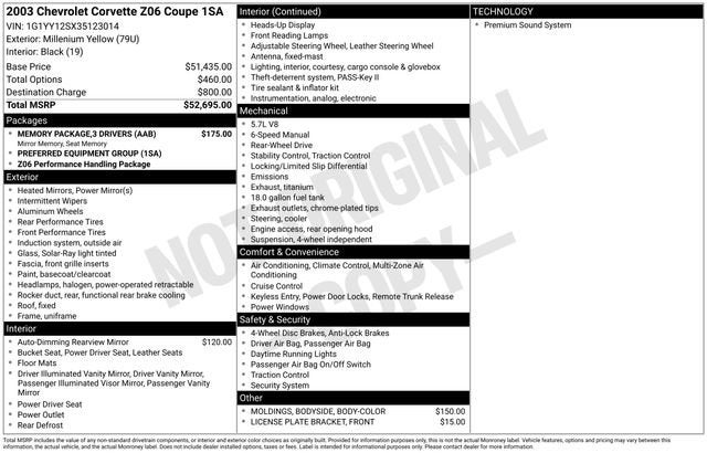 Unleash the power of pure performance with this stunning 2003 Chevrolet Corvette Z06 Hardtop. Boasting a potent 5.7L V8 SFI engine mated to a smooth-shifting 6-speed manual transmission, this sports car is engineered to thrill. With a sleek yellow exterior and a wealth of premium features, this Corvette Z06 is a true driver's delight.- Memory Package with 3 driver settings- Body-color bodyside moldings- Electrochromic auto-dimming mirrors- Head-Up Display- Highwear Nuance leather seat trim- Z06 bucket seatsDesigned to deliver an exhilarating driving experience, this Corvette Z06 offers impressive fuel efficiency, with an EPA-estimated 19 mpg in the city and 28 mpg on the highway. The powerful engine and responsive handling make this sports car a true joy to drive, whether you're carving through winding roads or cruising down the highway.Inside, the Corvette Z06 pampers you with a wealth of premium amenities, including dual-zone automatic climate control, a Bose audio system, and a leather-wrapped steering wheel. The Head-Up Display puts vital information right in your line of sight, allowing you to stay focused on the road ahead.With its striking appearance, exceptional performance, and impressive list of features, this 2003 Chevrolet Corvette Z06 Hardtop is a true automotive icon. Whether you're a seasoned enthusiast or a discerning buyer seeking a thrilling driving experience, this Corvette is sure to exceed your expectations.Don't miss the opportunity to make this exceptional sports car your own. Visit Navarre Chevrolet today and experience the power and passion of the Corvette Z06 firsthand.This vehicle is located at Navarre Chevrolet, 1300 East College Street, Lake Charles, LA 70607. Please call any of our Sales Professionals at 337-474-1999 for more details or to set an appointment.Visit our website http://www.navarreauto.com for more New, Pre-Owned, and Chevrolet Certified Specials!