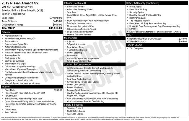 Brilliant Silver Metallic 2012 Nissan Armada SV RWD 5-Speed Automatic with Overdrive 5.6L 8-Cylinder SMPI DOHC
