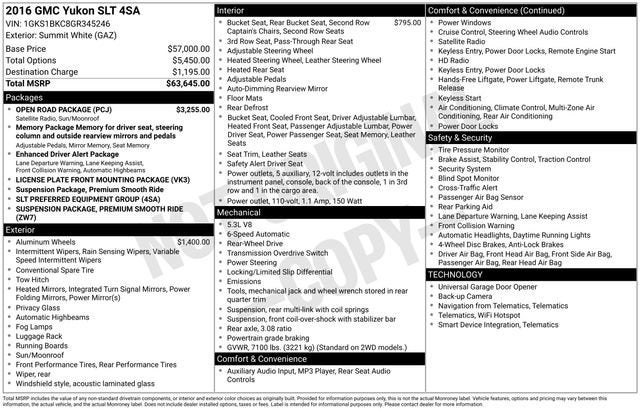 Discover the exceptional 2016 GMC Yukon SLT, a vehicle that combines unparalleled power, sophisticated style, and advanced technology to elevate your driving experience. With its impressive EcoTec3 5.3L V8 engine and 6-speed automatic transmission, this Yukon delivers exceptional performance and efficiency, offering 16 city/23 highway MPG.- Open Road Package with additional SiriusXM Radio and NavTraffic service, power sunroof, rear seat entertainment system, and premium audio system- 20 polished aluminum wheels and power second-row bucket seats- Enhanced Driver Alert Package, Premium Smooth Ride Suspension Package, and moreIndulge in the Yukon's premium features, including a Bose audio system, heated and cooled front seats, a hands-free power liftgate, and a rear-seat Blu-Ray/DVD entertainment system. The Yukon's advanced safety technologies, such as Forward Collision Alert, Lane Keep Assist, and Rear Cross-Traffic Alert, provide added peace of mind on the road.Elevate your driving experience with the exceptional 2016 GMC Yukon SLT. This versatile SUV offers ample space for passengers and cargo, making it the perfect companion for your adventures, whether it's a family road trip or a weekend getaway. With its powerful performance, luxurious amenities, and cutting-edge safety features, the Yukon SLT is sure to exceed your expectations.We understand that finding the right vehicle is a significant decision, and we're here to guide you through the process. Our knowledgeable sales professionals are dedicated to ensuring you have all the information you need to make an informed choice. We invite you to schedule a test drive and experience the remarkable 2016 GMC Yukon SLT for yourself.This vehicle is located at Navarre Chevrolet, 1300 East College Street, Lake Charles, LA 70607. Please call any of our Sales Professionals at 337-474-1999 for more details or to set an appointment.Visit our website http://www.navarreauto.com for more New, Pre-Owned, and Chevrolet Certified Specials!
