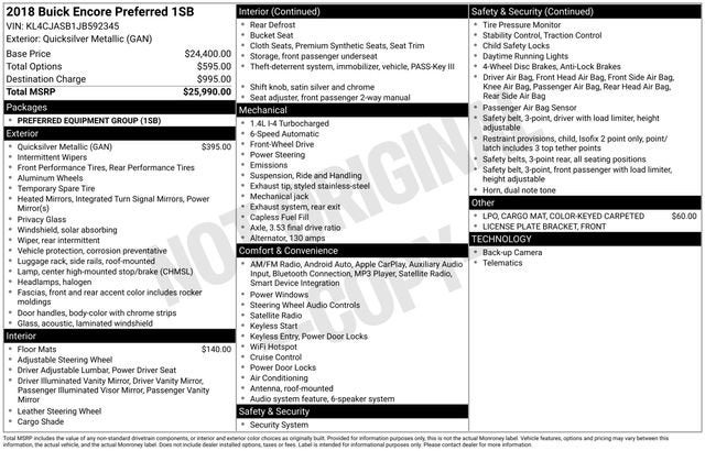 NAVARRE AS IS SPECIAL!Elevate your driving experience with this exceptional 2018 Buick Encore Preferred. Boasting a sleek Quicksilver Metallic exterior and a well-appointed interior, this compact SUV is the perfect blend of style and functionality.- Premium All-Weather Floor Liners (LPO)- Color-Keyed Carpeted Cargo Mat (LPO)- Preferred Equipment Group 1SBPowered by the efficient ECOTEC 1.4L I4 SMPI DOHC Turbocharged VVT engine, this Encore delivers an impressive 25 city / 33 highway MPG, ensuring you can tackle your daily commute or weekend adventures with confidence. The 6-Speed Automatic Electronic with Overdrive transmission provides smooth and responsive power delivery, while the front-wheel-drive configuration offers a comfortable and composed ride.Inside, you'll find a wealth of premium features that elevate your driving experience, including a Buick Infotainment System with SiriusXM Satellite Radio, a 6-Speaker Audio System, and a Power Driver's Seat. Stay connected with Apple CarPlay and Android Auto, and enjoy the convenience of Remote Keyless Entry and Steering Wheel-Mounted Audio Controls.Safety is also a top priority, with features like Dual Front Impact Airbags, Dual Front Side Impact Airbags, Overhead Airbag, and an Exterior Parking Camera Rear. The 4-Wheel Disc Brakes and Electronic Stability Control provide confident handling, while the Traction Control system helps you maintain control in any driving conditions.With its impressive combination of style, technology, and safety, this 2018 Buick Encore Preferred is the perfect choice for the discerning driver. Experience the difference for yourself – schedule a test drive today and discover the joy of owning this exceptional vehicle.This vehicle is BEING SOLD AS IS at Navarre Chevrolet, 1300 East College Street, Lake Charles, LA 70607. Please call any of our Sales Professionals at 337-474-1999 for more details or to set an appointment.Visit our website http://www.navarreauto.com for more New, Pre-Owned, and Chevrolet Certified Specials!