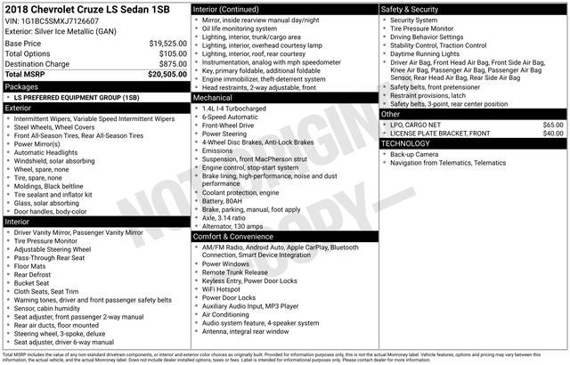 This 2018 Chevrolet Cruze LS is the perfect blend of style, efficiency, and technology. With its well-appointed features and impressive performance, it's the ideal choice for the savvy car buyer seeking a reliable and versatile compact sedan.