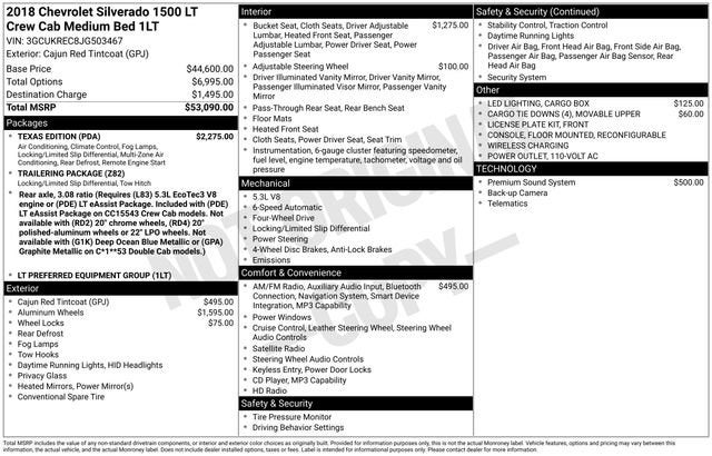 Elevate your driving experience with this remarkable 2018 Chevrolet Silverado 1500 LT LT1. Boasting a powerful EcoTec3 5.3L V8 engine and 4-wheel drive, this truck is ready to tackle any terrain with confidence.- Heated front seats with 10-way power driver's seat- Chevrolet MyLink Radio with 8 diagonal color touch-screen and navigation- Bose premium audio system with 6 speakers- Remote vehicle starter system- Texas Edition package with unique badging and premium featuresThis Silverado's stunning Cajun Red Tintcoat exterior is complemented by a spacious and well-appointed interior, offering the perfect blend of style and capability. With seating for up to six, this truck is ready to accommodate your family and friends in comfort.The Trailering Package and locking rear differential make this Silverado an exceptional choice for those with active lifestyles, providing the power and control needed to haul your toys or tackle tough jobs with ease. Enjoy the convenience of the EZ Lift & Lower tailgate, LED cargo box lighting, and the 110-volt power outlet, ensuring you have the features to get the job done right.Experience the confidence and capability of this 2018 Chevrolet Silverado 1500 LT LT1. Schedule a test drive today and discover why this truck is the perfect companion for your next adventure.This vehicle is located at Navarre Chevrolet, 1300 East College Street, Lake Charles, LA 70607. Please call any of our Sales Professionals at 337-474-1999 for more details or to set an appointment.Visit our website http://www.navarreauto.com for more New, Pre-Owned, and Chevrolet Certified Specials!