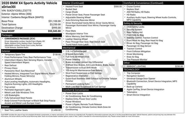 Elevate Your Driving Experience with This Exceptional 2020 BMW X4 xDrive30iDiscover the perfect balance of performance, style, and technology in this stunning 2020 BMW X4 xDrive30i. With its sleek exterior, spacious interior, and impressive array of features, this SUV is poised to exceed your expectations and redefine your driving experience.- Space-Saver Spare- Heated Front Seats- Ambient Lighting- Canberra Beige/Black, Vernasca Leather Upholstery- Convenience Package: Includes Comfort Access Keyless Entry, Lumbar Support, SiriusXM Satellite Radio with 1 Year All Access SubscriptionPowered by a 2.0L I4 TwinPower Turbo engine and an 8-Speed Automatic Sport transmission, this BMW X4 delivers an exhilarating performance with its impressive 23 city/28 highway MPG ratings. Experience the confidence of all-wheel drive, ensuring a smooth and capable ride in any condition.Step inside and be captivated by the refined and meticulously crafted cabin. The Vernasca leather upholstery and ambient lighting create a truly luxurious atmosphere, while the Convenience Package elevates your driving experience with features like Comfort Access Keyless Entry, Lumbar Support, and the convenience of SiriusXM Satellite Radio.This BMW X4 is packed with a wealth of advanced technologies to keep you connected, entertained, and safe. Enjoy seamless integration with your smartphone through Apple CarPlay Compatibility, and stay informed with the Navigation System and Exterior Parking Camera Rear.Elevate your driving experience and make a lasting impression with this exceptional 2020 BMW X4 xDrive30i. Discover the perfect blend of power, style, and sophistication that will have you eagerly anticipating every journey.This vehicle is located at Navarre Chevrolet, 1300 East College Street, Lake Charles, LA 70607. Please call any of our Sales Professionals at 337-474-1999 for more details or to set an appointment.Visit our website http://www.navarreauto.com for more New, Pre-Owned, and Chevrolet Certified Specials!