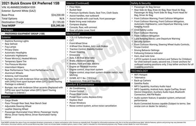CARFAX One-Owner. Summit White 2021 Buick Encore GX Preferred FWD CVT ECOTEC 1.2L Turbo