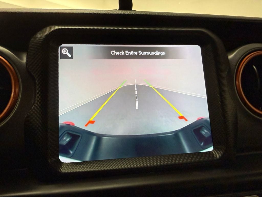 Stepping inside, the Gladiator Mojave's premium cabin features black leather-trimmed bucket seats, a full-length floor console, and a leather-wrapped shift knob and park brake handle. The 8.4-inch Uconnect 4C NAV touchscreen display with GPS navigation, SiriusXM Traffic Plus, and the Alpine premium audio system provide seamless connectivity and entertainment.