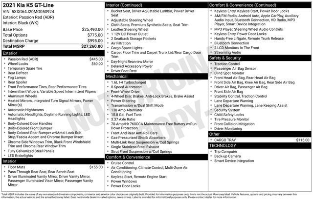 Elevate your driving experience with this captivating 2021 Kia K5 GT-Line. Boasting a striking Passion Red exterior and a host of premium features, this sedan is poised to exceed your expectations.