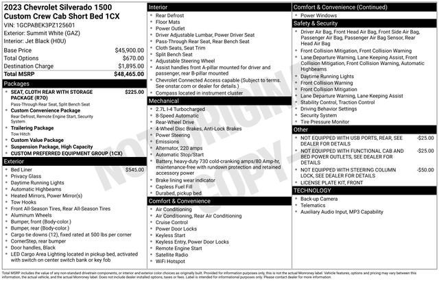 Cloth Rear Seat w/Storage Package, Custom Convenience Package (Electric Rear-Window Defogger, EZ Lift Power Lock & Release Tailgate, LED Cargo Area Lighting, Remote Vehicle Starter System, and Theft Deterrent System (Unauthorized Entry)), Custom Value Package, High Capacity Suspension Package, Preferred Equipment Group 1CX (10-Way Power Driver Seat w/Lumbar, 120-Volt Bed Mounted Power Outlet, 120-Volt Instrument Panel Power Outlet, 3.5 Monochromatic Display Driver Info Center, Bluetooth® For Phone, Chevrolet Connected Access Capable, Color-Keyed Carpeting Floor Covering, Compass, Deep-Tinted Glass, Dual Rear USB Ports (Charge Only), Electrical Steering Column Lock, Electronic Cruise Control, Front Frame-Mounted Black Recovery Hooks, Front Rubberized Vinyl Floor Mats, HD Rear Vision Camera, Manual Tilt Wheel Steering Column, OnStar & Chevrolet Connected Services Capable, Power Front Windows w/Driver Express Up/Down, Power Front Windows w/Passenger Express Down, Power Rear Windows w/Express Down, Rear 60/40 Folding Bench Seat (Folds Up), Rear Rubberized-Vinyl Floor Mats, Remote Keyless Entry, SiriusXM Radio, Standard Tailgate, Wi-Fi Hot Spot Capable, and Wireless Phone Projection), Trailering Package (Hitch Guidance), 8-Speed Automatic, Black Cloth, 3.42 Rear Axle Ratio, 4-Wheel Disc Brakes, 40/20/40 Front Split-Bench Seat, 6 Speakers, 6-Speaker Audio System, ABS brakes, Air Conditioning, Alloy wheels, AM/FM radio: SiriusXM, Apple CarPlay/Android Auto, Auto High-beam Headlights, Automatic Emergency Braking, Brake assist, Bumpers: body-color, Chevytec Spray-On Black Bedliner, Cloth Seat Trim, Delay-off headlights, Driver door bin, Driver vanity mirror, Dual front impact airbags, Dual front side impact airbags, Electronic Stability Control, Following Distance Indicator, Forward Collision Alert, Front anti-roll bar, Front Center Armrest w/Storage, Front License Plate Kit, Front Pedestrian Braking, Front reading lights, Front wheel independent suspension, Fully automatic headlights, Heated door mirrors, Illuminated entry, IntelliBeam Automatic High Beam On/Off, Lane Keep Assist w/Lane Departure Warning, Low tire pressure warning, Not Equipped w/Functional Cab & Bed Power Outlets, Not Equipped w/Rear USB Ports, Not Equipped w/Steering Column Lock, Occupant sensing airbag, Outside temperature display, Overhead airbag, Overhead console, Panic alarm, Passenger door bin, Passenger vanity mirror, Power door mirrors, Power driver seat, Power steering, Power windows, Premium audio system: Chevrolet Infotainment 3, Radio data system, Radio: Chevrolet Infotainment 3 System, Rear reading lights, Rear step bumper, Rear window defroster, Remote keyless entry, Security system, Speed control, Speed-sensing steering, Split folding rear seat, Tachometer, Tilt steering wheel, Traction control, Trip computer, Variably intermittent wipers, Voltmeter, Wheels: 20 x 9 Bright Silver Painted Aluminum, and Wheels: 20 x 9 High Gloss Black Painted Alum. 8-Speed Automatic, Black Cloth.
