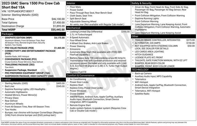 Elevate your driving experience with this exceptional 2023 GMC Sierra 1500 Pro. Boasting a powerful 2.7L I4 Turbocharged engine, this truck delivers an impressive 310 horsepower and 4-wheel drive capability, ensuring you conquer any terrain with confidence.- Spray-On Pickup Bed Liner- Auto-Locking Rear Differential- Graphite Edition- Pro Value Package- Connectivity & Entertainment Package- Convenience Package- Trailering PackageThis Sierra 1500 Pro is equipped with a wealth of premium features that elevate your driving experience. Enjoy the convenience of Remote Start, Integrated Trailer Brake Controller, and Wireless Phone Projection, seamlessly integrating your digital life with your vehicle. The Graphite Edition adds a touch of style with its body-color accents and 20-inch high-gloss black wheels.Whether you're hauling heavy loads or embarking on weekend adventures, this Sierra 1500 Pro is ready to handle it all. The 4-wheel drive system and 220-amp alternator ensure you have the power and capability to conquer any challenge. The integrated trailer brake controller and trailering package make towing a breeze, while the spray-on bedliner protects your cargo.Step inside and experience the impressive array of technology and comfort features. The GMC Infotainment System with SiriusXM Radio keeps you entertained, while the push-button start, power windows, and remote keyless entry provide exceptional convenience. The heated power-adjustable mirrors and LED cargo area lighting add both style and function to your driving experience.Safety is also a top priority, with features like Automatic Emergency Braking, Forward Collision Alert, and Lane Keep Assist with Lane Departure Warning keeping you and your loved ones protected on the road.This 2023 GMC Sierra 1500 Pro is the perfect blend of power, capability, and premium features. Experience the difference for yourself and schedule a test drive today.This vehicle is located at Navarre Chevrolet, 1300 East College Street, Lake Charles, LA 70607. Please call any of our Sales Professionals at 337-474-1999 for more details or to set an appointment.Visit our website http://www.navarreauto.com for more New, Pre-Owned, and Chevrolet Certified Specials!