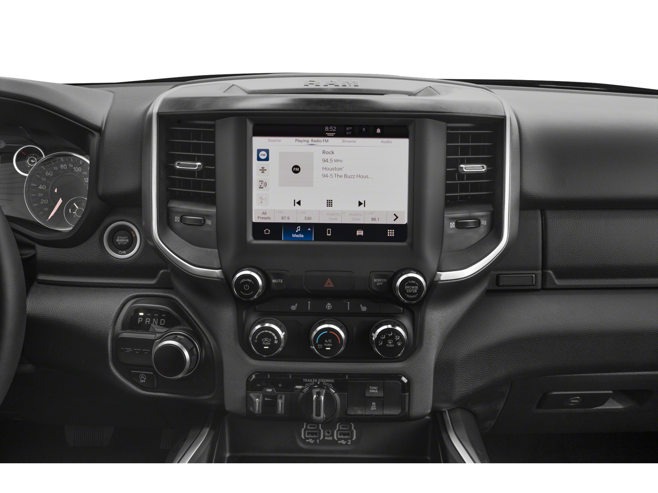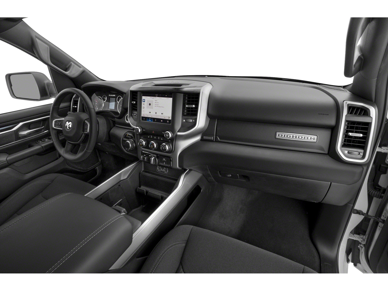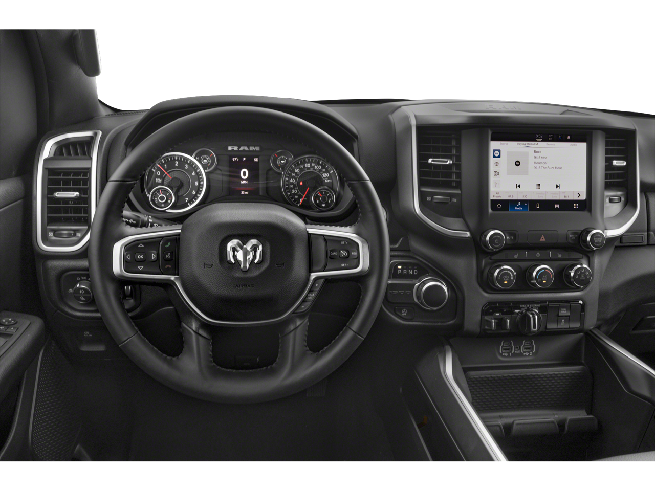 10 Speakers, 3 Rear Seat Head Restraints, 3.21 Rear Axle Ratio, 4 Way Front Headrests, 4-Wheel Disc Brakes, 48V Belt Starter Generator, 4G LTE Wi-Fi Hot Spot, ABS brakes, Air Conditioning, Alloy wheels, AM/FM radio: SiriusXM with 360L, Apple CarPlay, Apple CarPlay/Android Auto, Audio memory, Auto-dimming door mirrors, Auto-Dimming Exterior Driver Mirror, Auto-dimming Rear-View mirror, Automatic temperature control, Brake assist, Bumpers: chrome, Chrome Exterior Mirrors, Compass, Connected Travel & Traffic Services, Connectivity - US/Canada, Convex Wide-Angle Exterior Mirror Insert, Delay-off headlights, Driver door bin, Driver Seat Memory, Driver vanity mirror, Dual front impact airbags, Dual front side impact airbags, Electronic Stability Control, Exterior Mirrors Courtesy Lamps, Exterior Mirrors w/Heating Element, Exterior Mirrors w/Memory, Exterior Mirrors w/Supplemental Signals, Exterior Parking Camera Rear, For Details, Visit DriveUconnect.com, For More Info, Call 800-643-2112, Front anti-roll bar, Front Center Armrest w/Storage, Front dual zone A/C, Front fog lights, Front reading lights, Front Seat Back Map Pockets, Front wheel independent suspension, Fully automatic headlights, Garage door transmitter, Global Telematics Box Module (TBM), Google Android Auto, GPS Navigation, HD Radio, Heated door mirrors, Heated Front Seats, Heated front seats, Heated Steering Wheel, Heated steering wheel, Illuminated entry, Integrated Voice Command w/Bluetooth®, Leather steering wheel, Leather Trim 40/20/40 Bench Seat, Low tire pressure warning, Memory seat, Navigation System, Occupant sensing airbag, Outside temperature display, Overhead airbag, Overhead console, Panic alarm, Passenger door bin, Passenger vanity mirror, Power 2-Way Driver Lumbar Adjust, Power 2-Way Passenger Lumbar Adjust, Power 8-Way Driver & Passenger Seats, Power door mirrors, Power driver seat, Power passenger seat, Power steering, Power windows, Power-Folding Mirrors, Radio data system, Radio: Uconnect 5 Nav w/8.4 Display, RAM Grille Badge - Chrome, Rear 60/40 Folding Seat, Rear anti-roll bar, Rear seat center armrest, Rear step bumper, Remote keyless entry, Security system, SiriusXM Radio Service, SiriusXM w/360L, Speed control, Split folding rear seat, Steering wheel mounted audio controls, Tachometer, Telescoping steering wheel, Tilt steering wheel, Traction control, Trip computer, Turn signal indicator mirrors, Variably intermittent wipers, Ventilated Front Seats, Ventilated front seats, Voltmeter, and Wheels: 18 x 8 Aluminum Base PainteD.