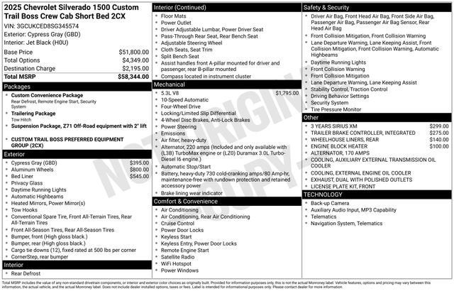 Elevate your driving experience with the exceptional 2025 Chevrolet Silverado 1500 Custom Trail Boss. This rugged and capable pickup is designed to conquer any terrain, whether you're tackling the great outdoors or navigating the city streets.Boasting a host of impressive features, this Silverado 1500 is truly a standout. Key highlights include:- Wheelhouse liners- Chevytec spray-on bedliner- Trailer brake controller- Engine block heater- Powerful 5.3L V8 EcoTec3 engine with Dynamic Fuel Management- 3 years of SiriusXM satellite radio- 20-inch high-gloss black painted aluminum wheelsThe Custom Convenience Package, Preferred Equipment Group 2CX, Suspension Package, and Trailering Package further enhance the Silverado's capabilities, offering a wealth of practical and cutting-edge technologies. Enjoy the convenience of dual rear USB ports, the EZ Lift power lock and release tailgate, and the 120-volt interior power outlet. Stay connected with Bluetooth® for phone, the SiriusXM trial subscription, and the available Wi-Fi hotspot.This Silverado 1500 also boasts impressive safety features, including Automatic Emergency Braking, Forward Collision Alert, Lane Keep Assist with Lane Departure Warning, and more. The HD Rear Vision Camera and Theft Deterrent System provide added peace of mind, while the Teen Driver feature helps ensure responsible driving.Whether you're hauling heavy loads, towing a trailer, or simply enjoying the open road, the 2025 Chevrolet Silverado 1500 Custom Trail Boss is the perfect companion. With its exceptional capabilities, advanced technology, and rugged good looks, this truck is sure to exceed your expectations.We invite you to experience the power and versatility of the 2025 Chevrolet Silverado 1500 Custom Trail Boss for yourself. Visit Navarre Chevrolet, 1300 East College Street, Lake Charles, LA 70607, or call our Sales Professionals at 337-474-1999 to schedule a test drive. Discover the difference a Silverado can make in your life.This vehicle is located at Navarre Chevrolet, 1300 East College Street, Lake Charles, LA 70607. Please call any of our Sales Professionals at 337-474-1999 for more details or to set an appointment.Visit our website http://www.navarreauto.com for more New, Pre-Owned, and Chevrolet Certified Specials!